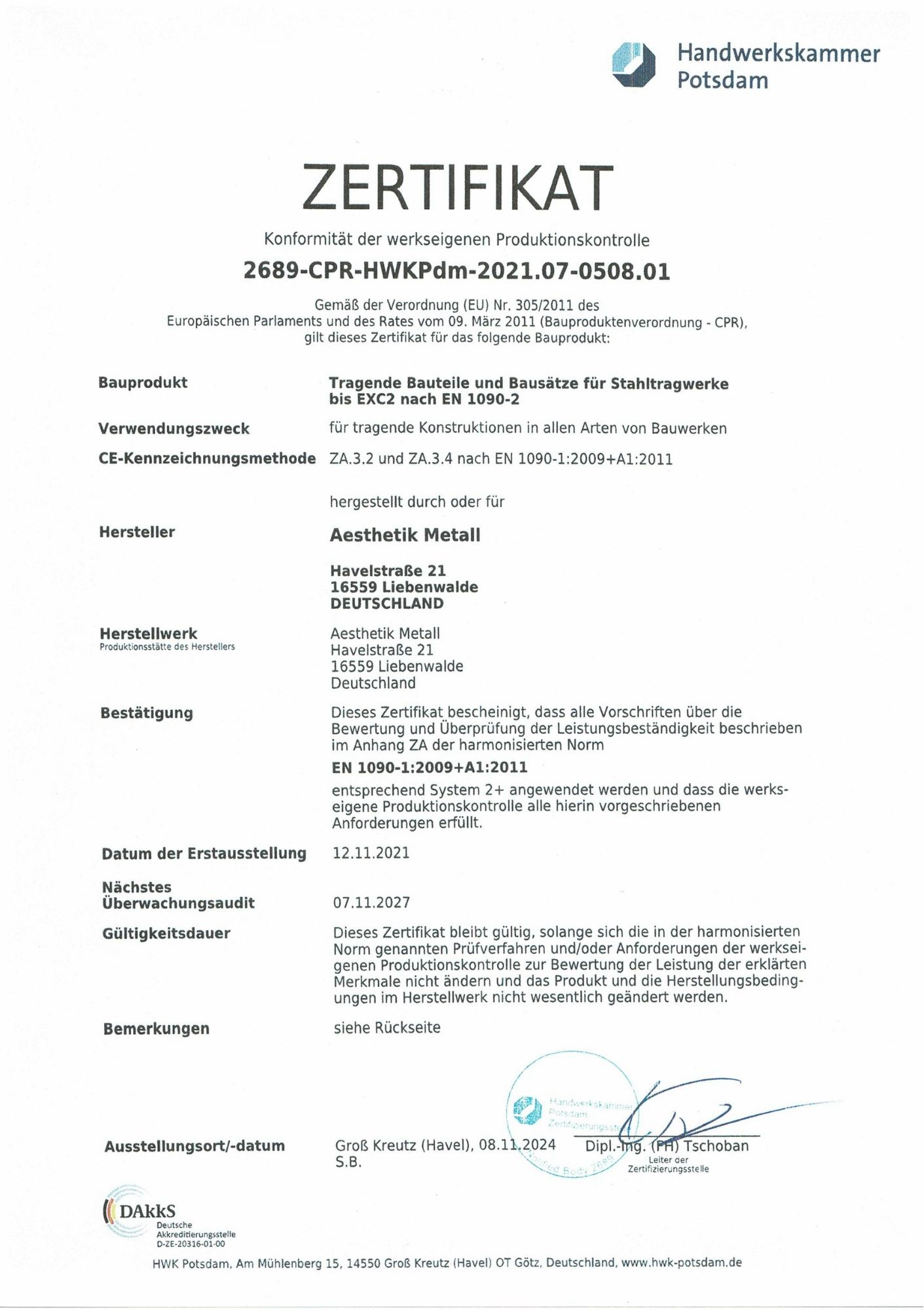 Tragende Bauteile und Bausätze für Stahltragwerke bis EXC2 nach EN 1090-2